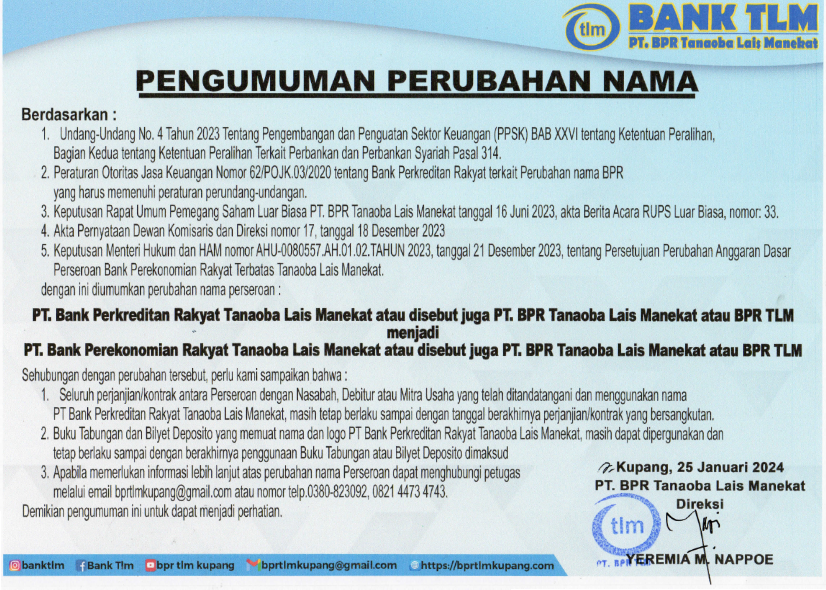 KATA BIJAK Di mana ada kebenaran di situ akan tumbuh damai sejahtera, dan akibat kebenaran ialah ketenangan dan ketenteraman untuk selama-lamanya. Yesaya 32:17 Transformasi SDM Bank TLM berdampak pada peningkatan daya saing & pelayanan kepada nasabah. BPR TLM