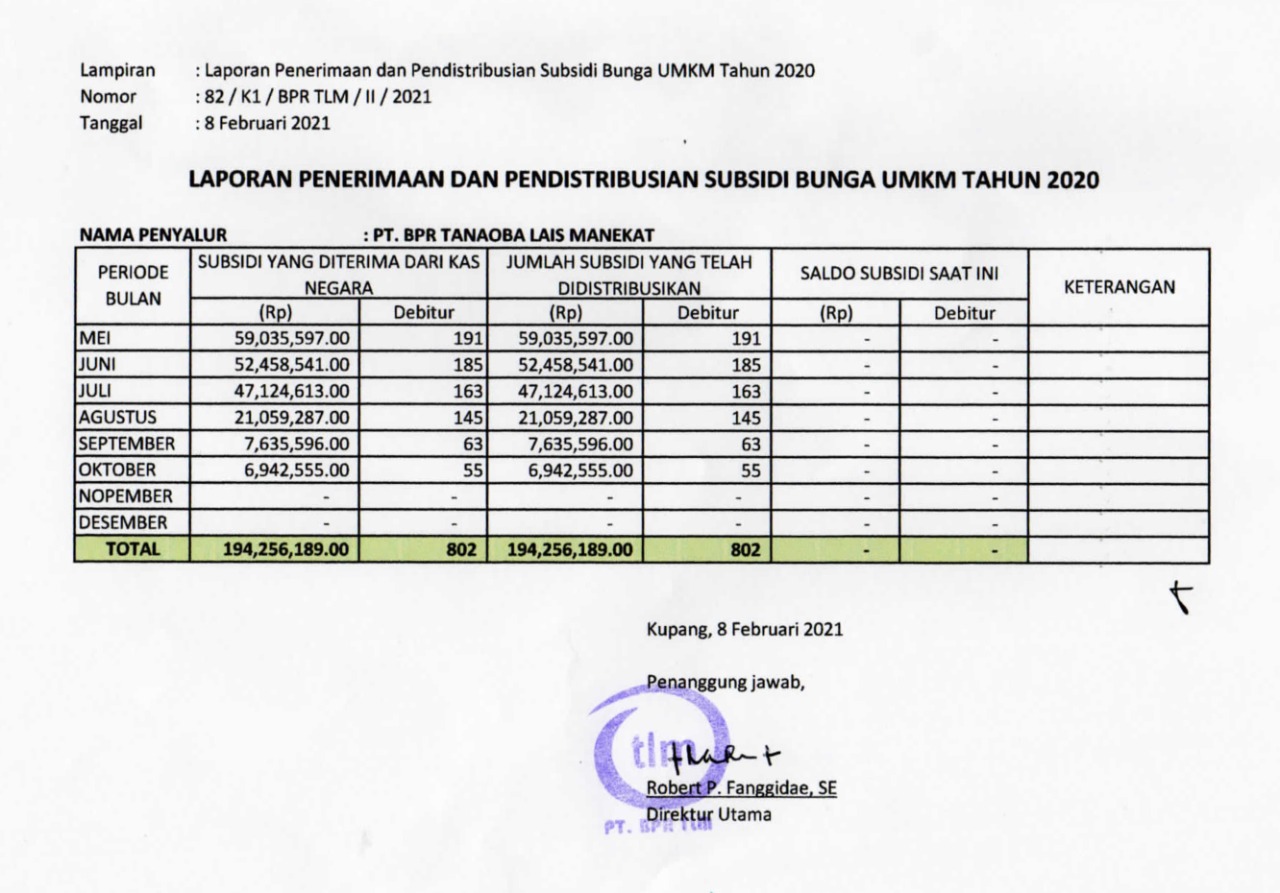 PT. BPR Tanaoba Lais Manekat dalam mendukung program Pemulihan Ekonomi Nasional juga ikut serta dan mendapat kepercayaan oleh Pemerintah untuk menerima dan mendistribusikan dana subsi bunga UMKM selama 6 bulan ditahun 2020 dengan total dana yang diterima dan didistribusikan sebesar Rp.194.256.189,- kepada 802 debitur. MELAYANI DENGAN KASIH.